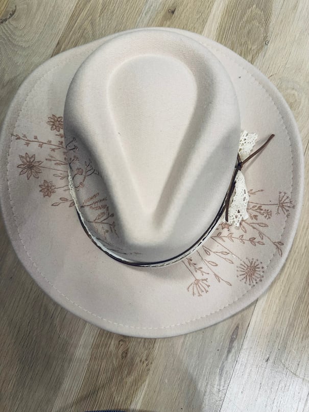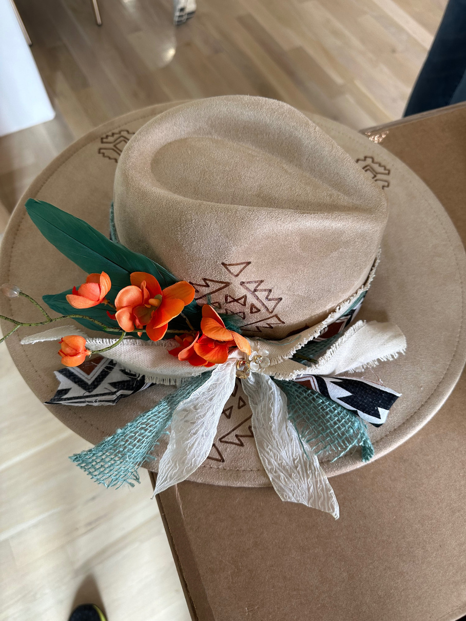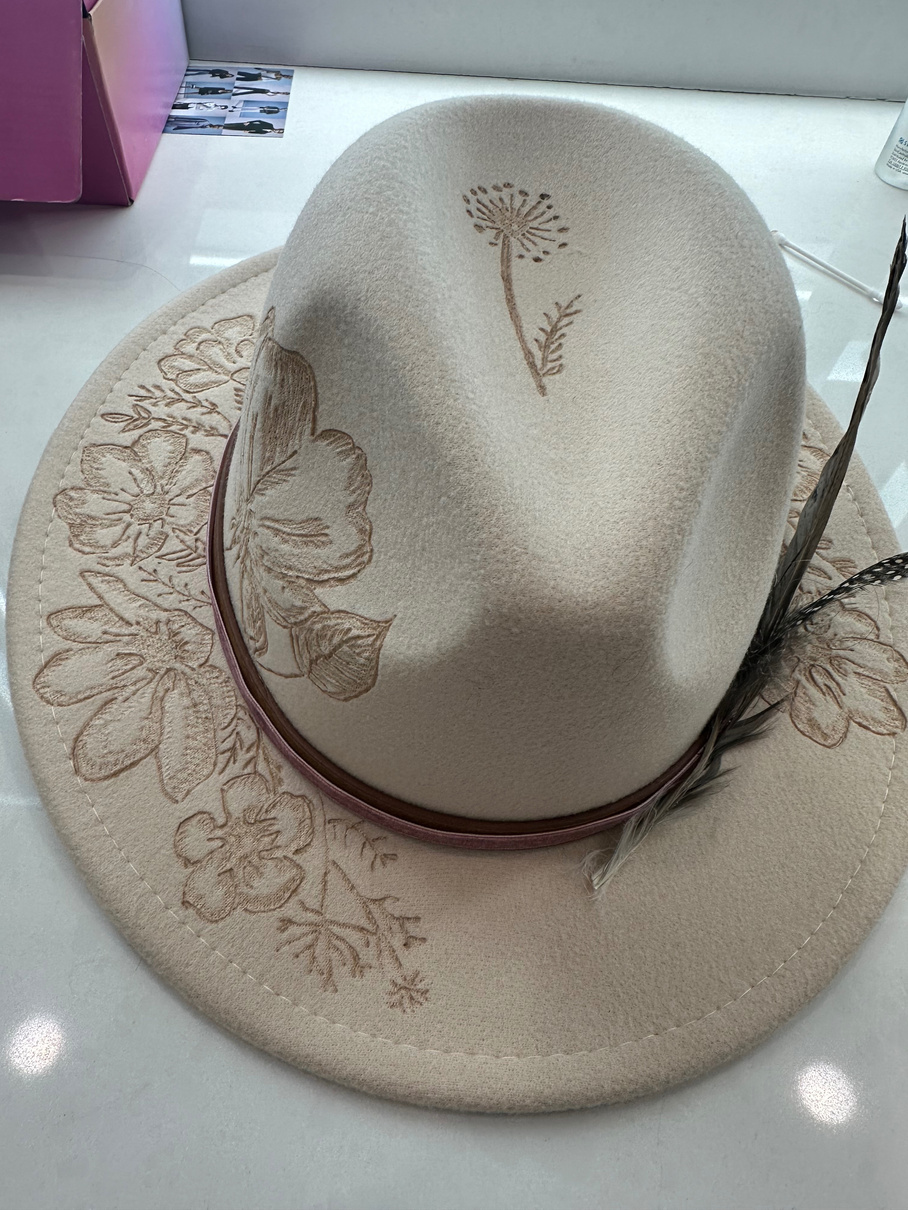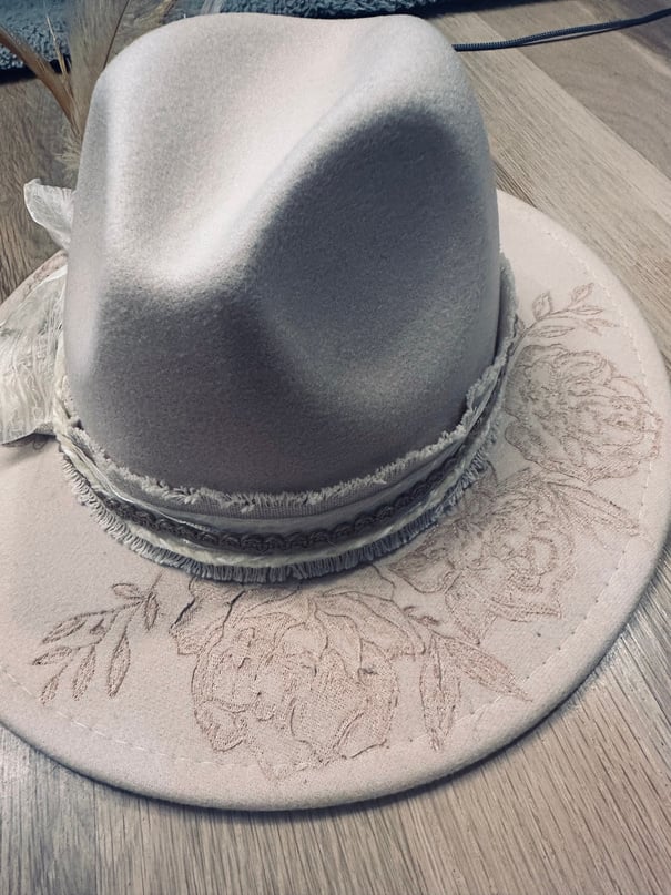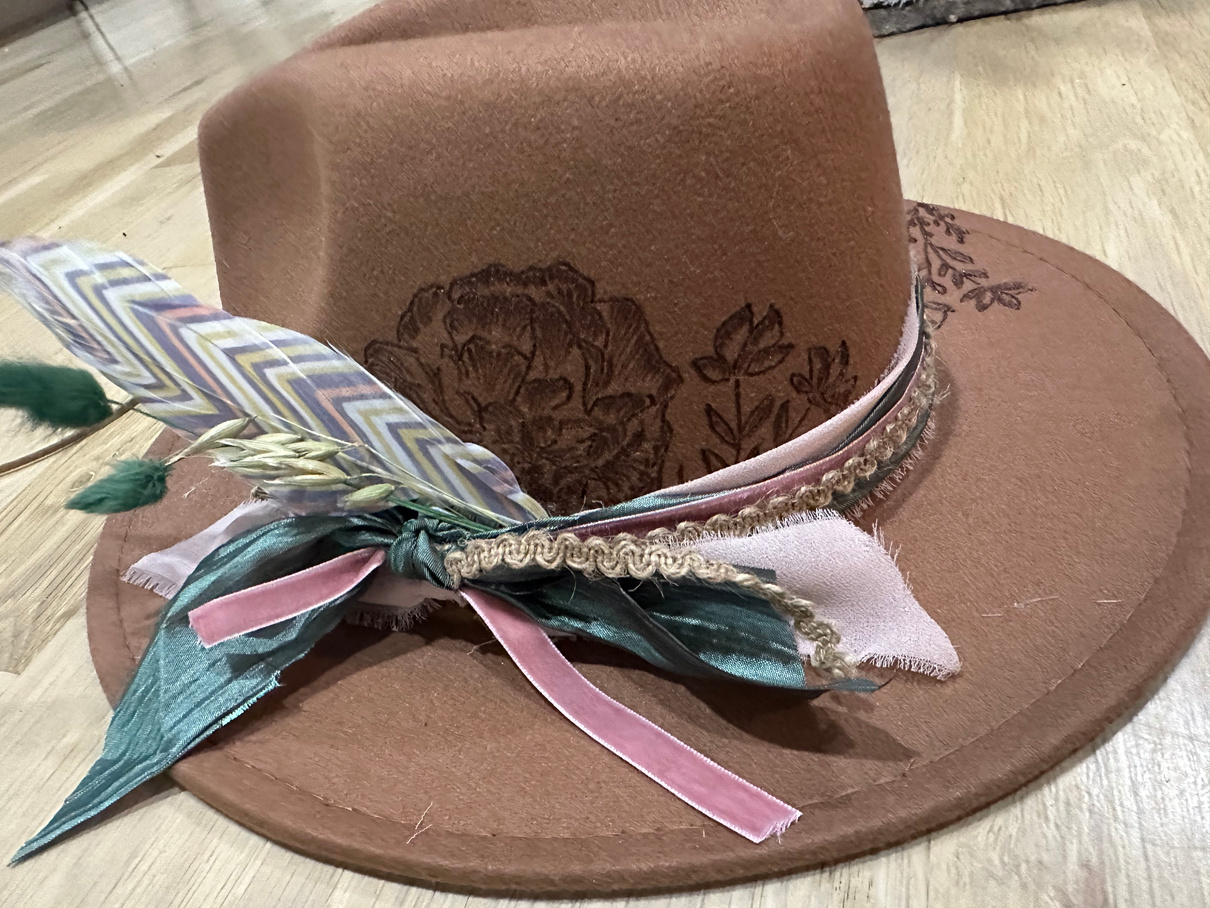 Each fedora is hand burned to create a design that is unique to each client. Bands, pins and feathers can be changed to make a personalized client touch.
