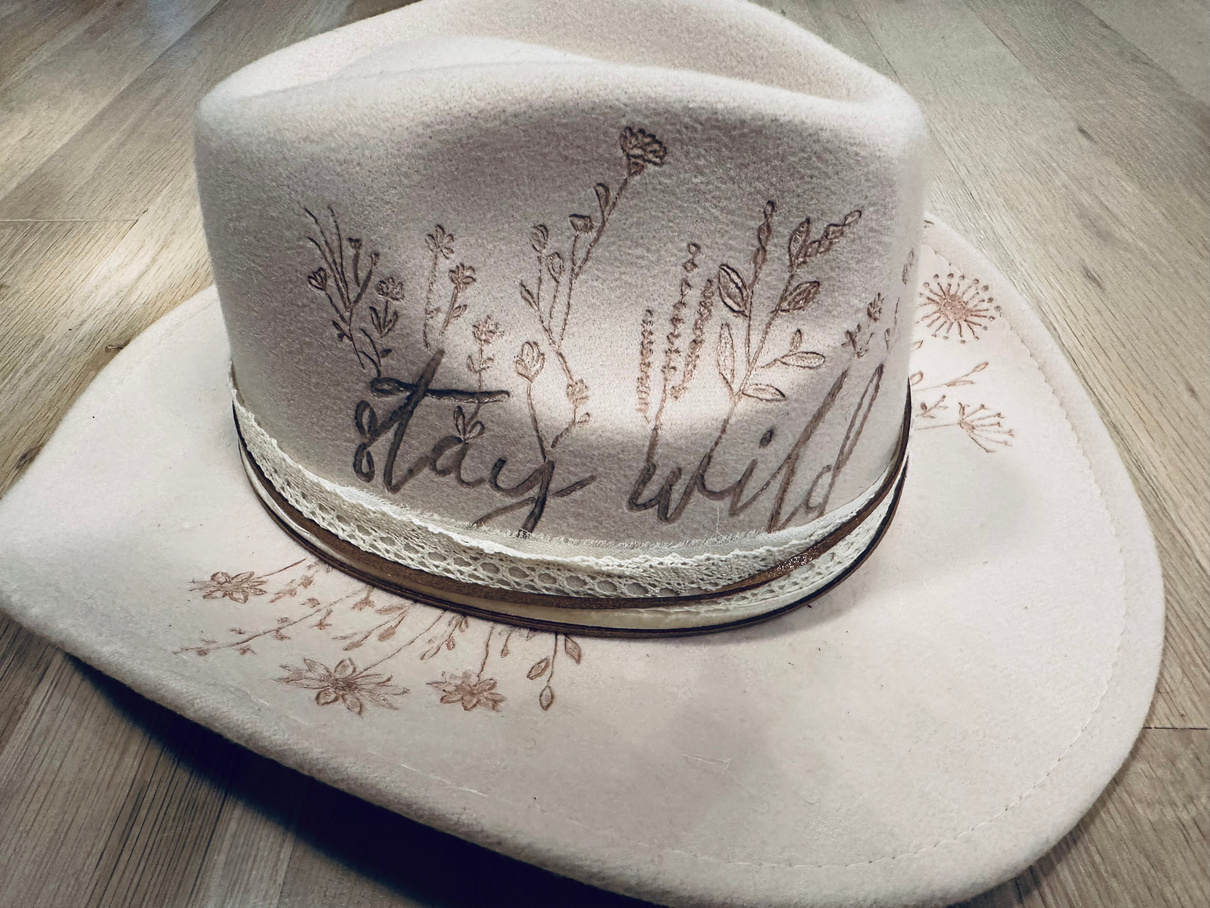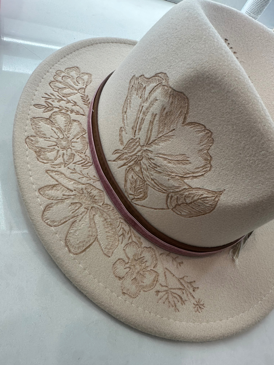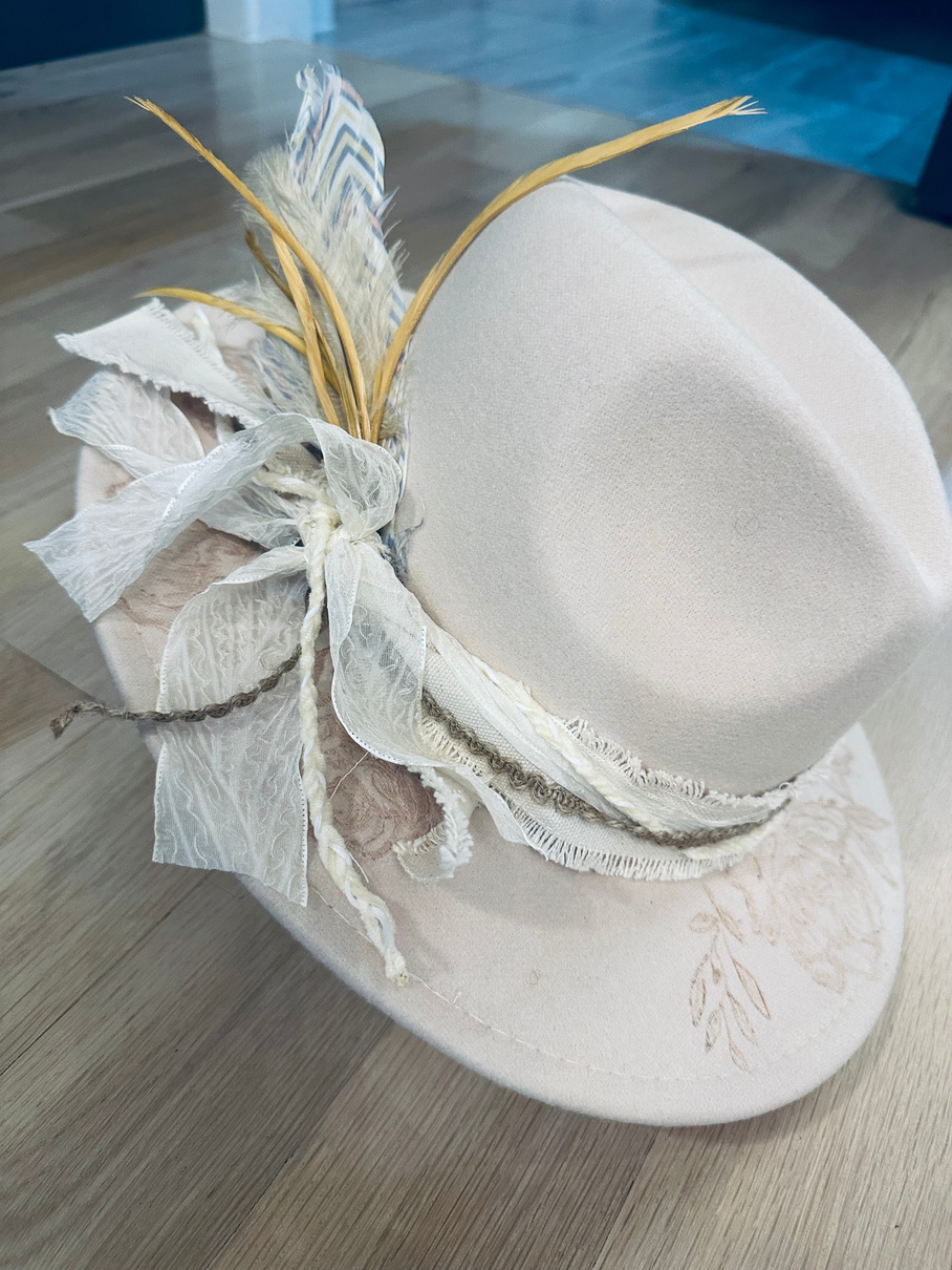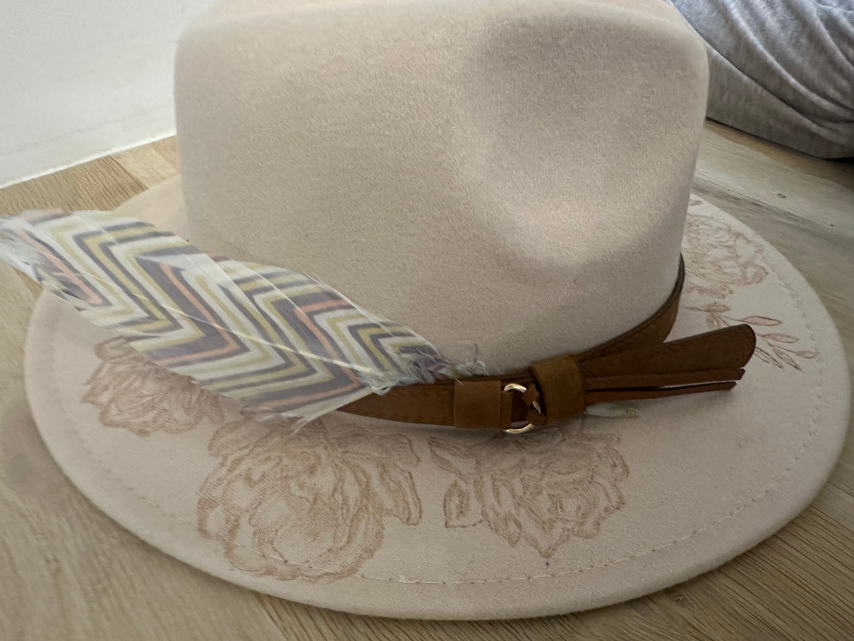 Each fedora is hand burned to create a design that is unique to each client. Bands, pins and feathers can be changed to make a personalized client touch.