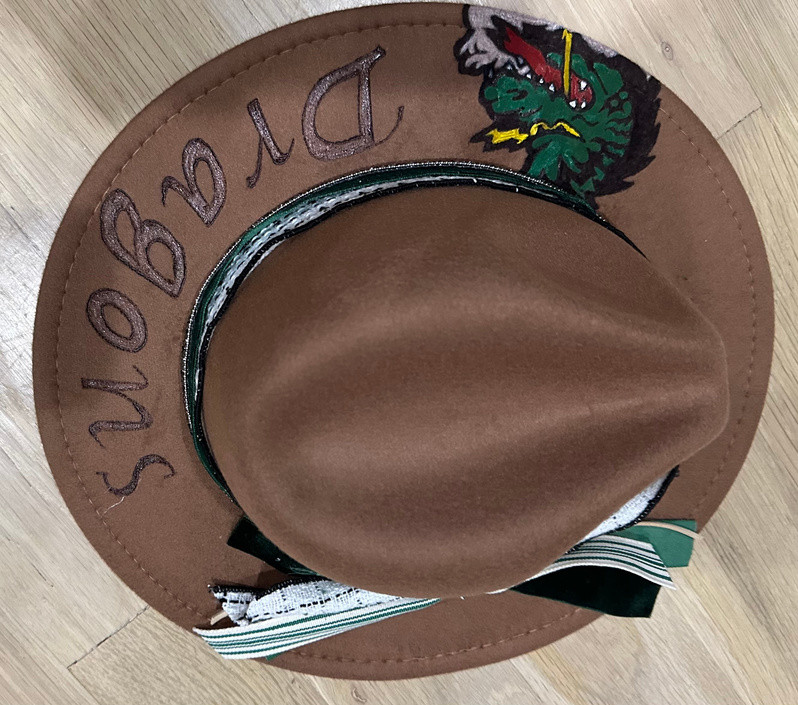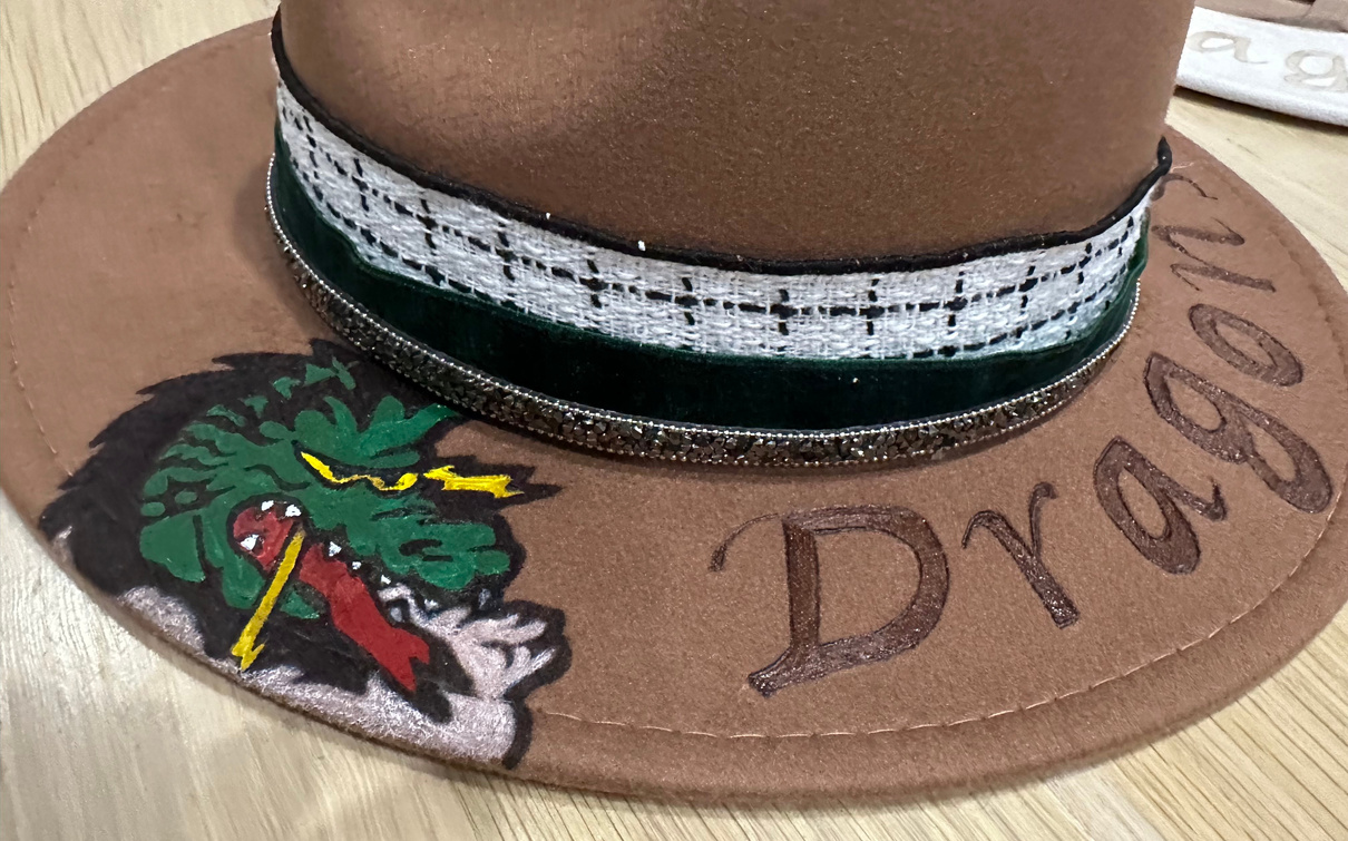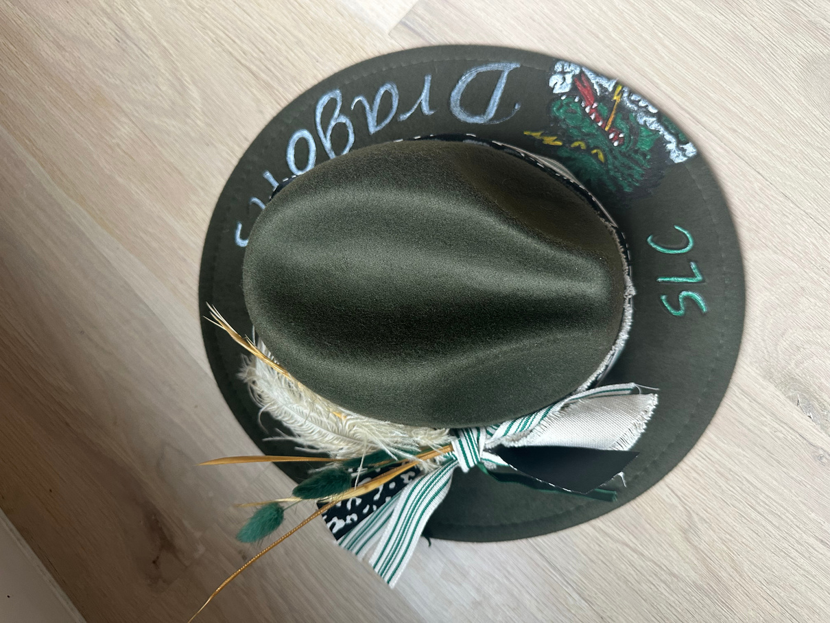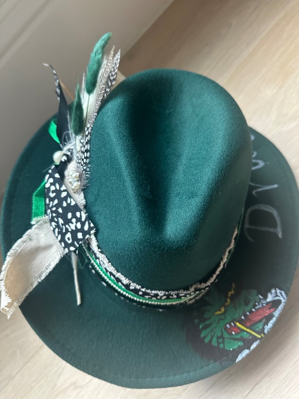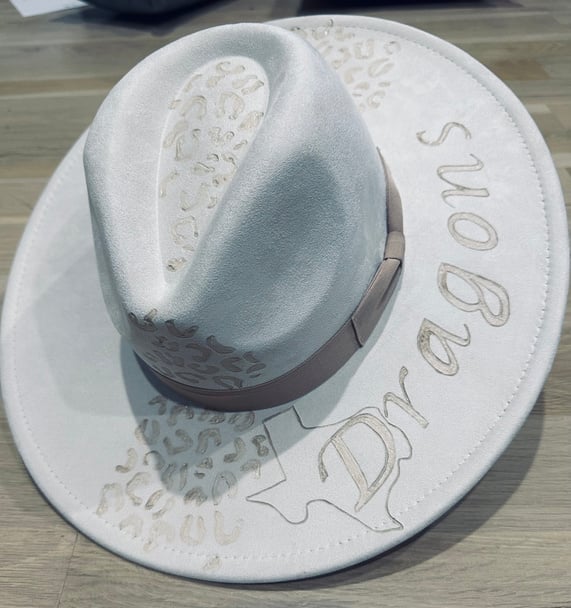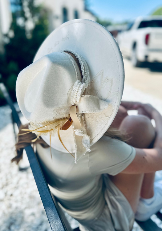 Each fedora is hand burned to create a design that is unique to each client. Bands, pins and feathers can be changed to make a personalized client touch.